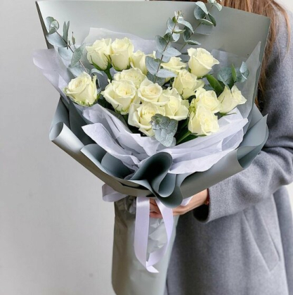 15 белых роз в объемной упаковке