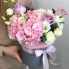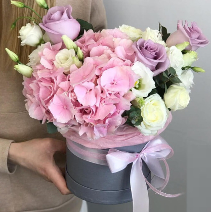 Шляпная коробка с гортензией, розами и лизуантусами | Купить в Дубне