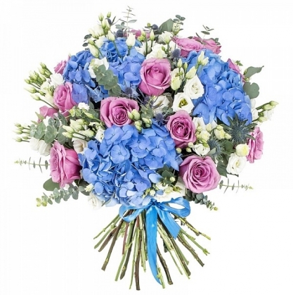 Букет из роз, гортензий, эустомы и экалипта с доставкой в Дубне