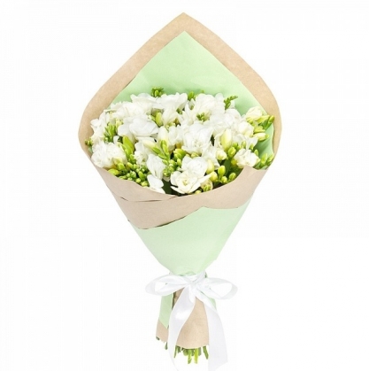 Букет из белой фрезии в стильной двойной упаковке.