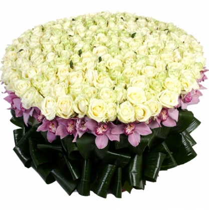 Большая корзина из роз и орхидей оформленная зеленью!