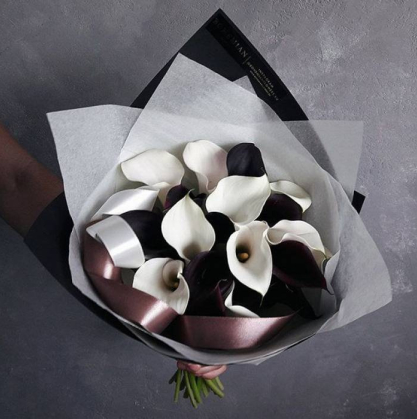 Необычное сочетание черных и белых калл. Обращаем ваше внимание, что черные каллы могут быть заменены на баклажановые.