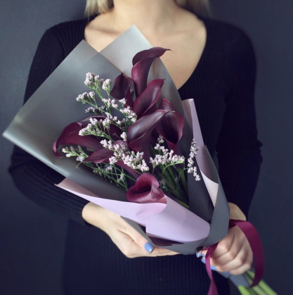 Букет из 9 фиолетовых калл с лимониумом | Купить в Дубне