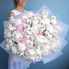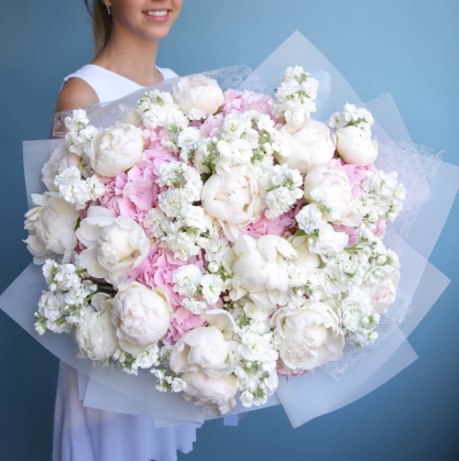 Современный букет из белых пионов и маттиолы, с добавлением яркой розовой гипсофилы. Очень пышный букет, способный привлечь внимание абсолютно любой девушки.