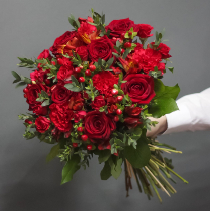 Авторский букет в красных тонах. Удивительное сочетание роз, гиперикума, гвоздики.