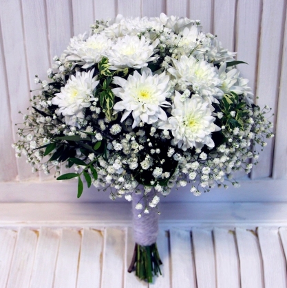 Букет невесты из хризантемы и гипсофилы