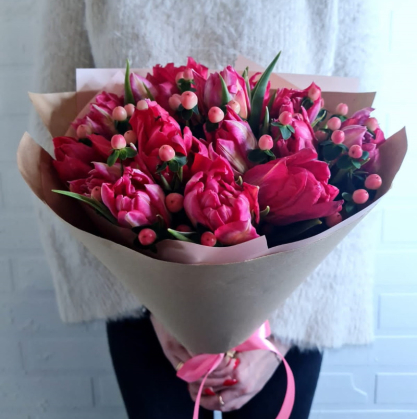Букет пионовидных тюльпанов с гиперикумом | Купить в Дубне