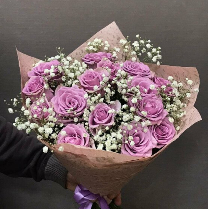 Фиолетовые розы с гипсофилой | Купить букет в Дубне с доставкой