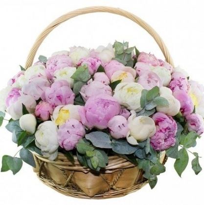 Невероятно красивая корзина из белых и розовых пионов. Особый образ и шик корзине предает добавление веточек эвкалипта.