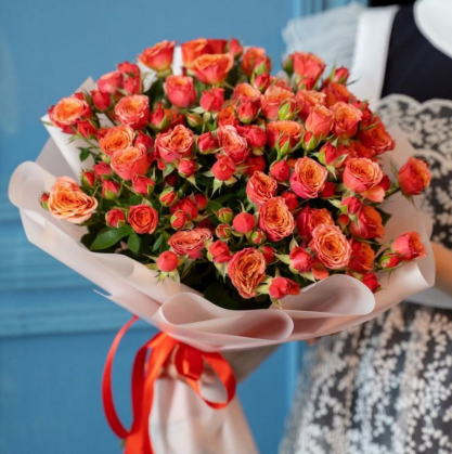 Букет из оранжевой кустовой розы. С помощью калькулятора можно выбрать любое количество цветов.