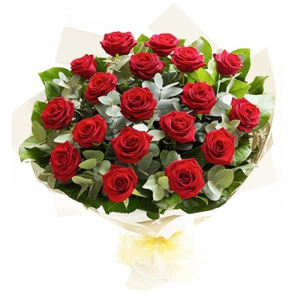 Букет, собранный в классическом стиле: красные розы с добавлением эвкалипта (baby blue) в упаковке. Очень изящная и нежная композиция, которую можно подарить как в будний день, так и на какое-либо торжество.