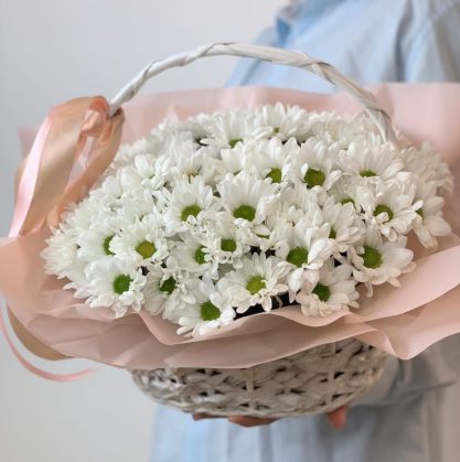 Простая, изящная корзина с кустовыми хризантемами вызовет улыбку как от самого доброго комплимента! Она идеально подходит для создания нежной и приятной атмосферы дома.