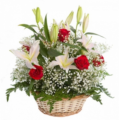 Шикарная корзина из лилий и роз, богато украшенная зеленью.