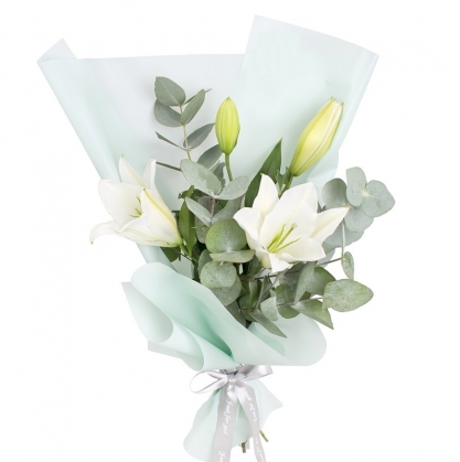 Букет из лилий с добавлением эвкалипта в стильной упаковке