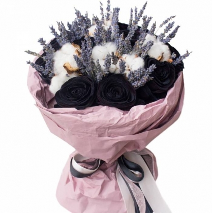 Букет состоящий из окрашеных роз , пучка лаванды и хлопка , в красивой упаковке. Ближайшее время доставки - не ранее, чем через 4 часа после заказа.
