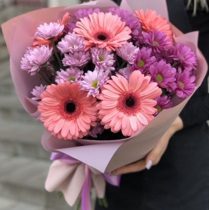 Сиреневые хризантемы и розовые герберы | Купить букет в Дубне