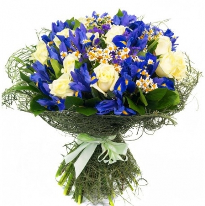 Чудесное сочетание роз, ирисов и ромашек (если нет в наличии, то заменяются ромашковыми хризантемами).