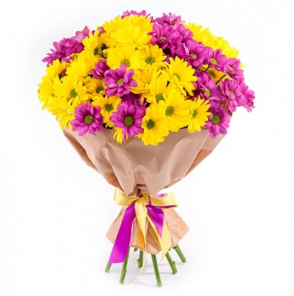 Букет из желтых и сиреневых хризантем "Солнечное настроение" | Купить в Дубне
