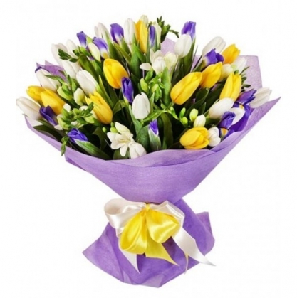 Букет "Три желания" из тюльпанов, ирисов и фрезии | Купить в Дубне